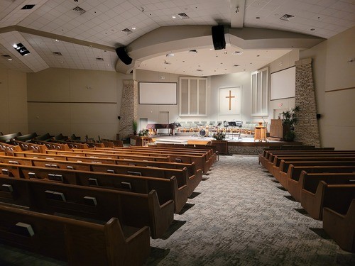 Our Sanctuary comfortably seats 400 people in the pews. Our pews are padded with ample leg room. Approximately 60 extra chairs can be placed in the back of the room for additional seating.