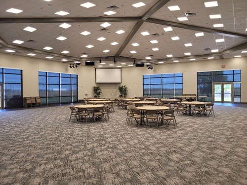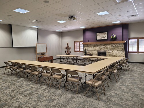 Our Fellowship Hall is a spacious area that can be configured in several different ways. Please click below to view the round table configuration. Please click below to view the chairs in rows configuration. Please click below to view rectangular tables configuration. Each configuration is shown at capacity.