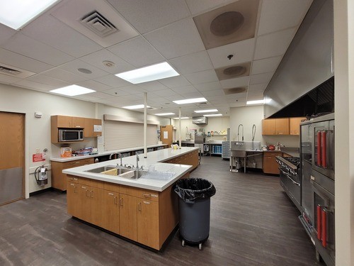 Our kitchen is equipped with an industrial dishwasher, multiple ovens, an ice machine, and multiple sinks. Currently, we share our kitchen space with a child care center, so we have health regulations to follow and require the kitchen to be left pristine when used.