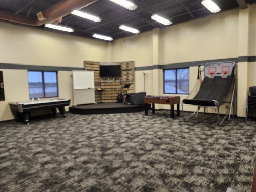 Our Jr. High Youth Room has a small stage, some game tables, some couches and booths. None of the furniture or games can be removed for an event.