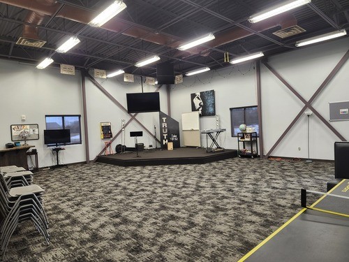 Our Sr. High Room has a small stage. It does have the capability to plug in a laptop to show on a screen. There are two booths to the side for seating, a counter area from which to serve food, some chairs and a Ping-Pong table. No furniture or game equipment will be moved out of this room for an event.