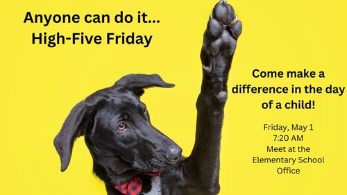 This coming Friday, May 1, we have the opportunity to participate in hi-five Friday at Hillsboro Elementary School. If you would like to participate, be at the Elementary School by 7:20 AM.